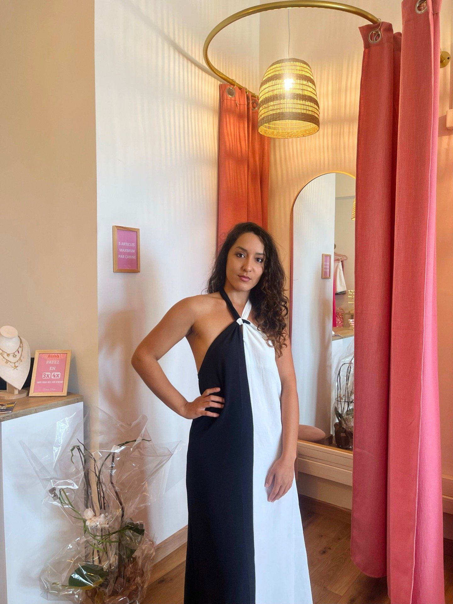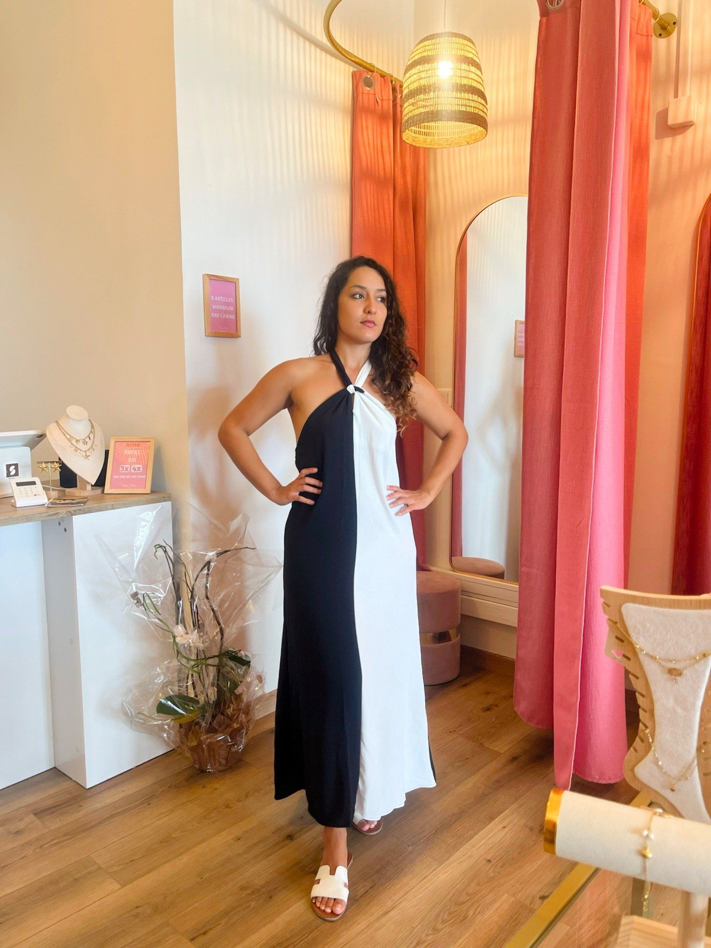 Robe longue Adèle, en couleur noire et blanche