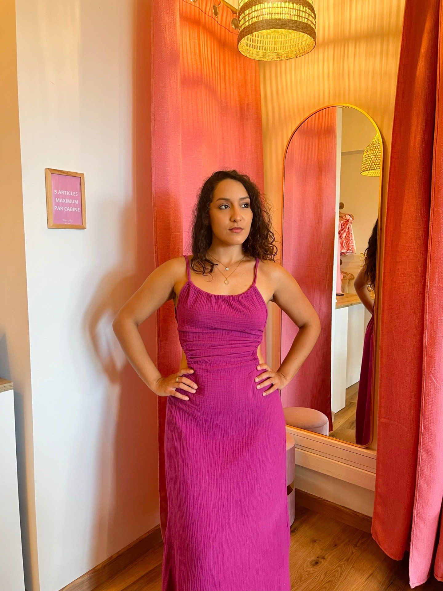 La longue robe dos nu Manon est la robe parfaite pour cet été. Accessoirise la avec un joli sac en paille.